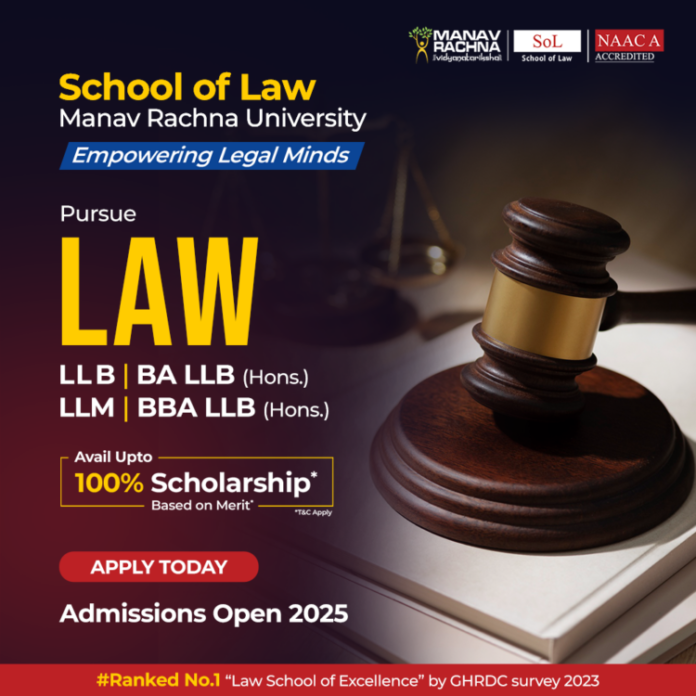 Manav Rachna University (MRU) is committed to developing competent legal professionals through national and international legal education. The School of Law has been recognized among the Top 25 Private Law Colleges in the North Zone and Top 90 Law Colleges in India by Business World (2022), also ranked India’s No. 1 Law School of Excellence by GHRDC, 2023.