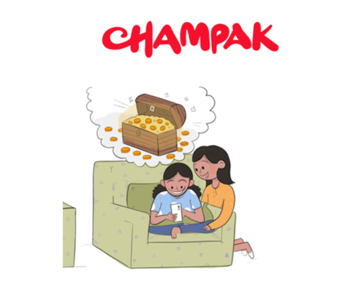 Illustration featuring two children sitting on a couch, looking at a phone together, with a thought bubble depicting a treasure chest filled with coins above them. The word 'CHAMPAK' is displayed prominently at the top.