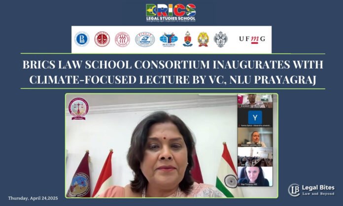 The BRICS Law Schools Consortium marked its academic debut on 25 April 2025 with an inaugural lecture by Sr. Prof. (Dr.) Usha Tandon, Hon’ble Vice Chancellor of Dr. Rajendra Prasad National Law University, Prayagraj. The lecture, delivered virtually, revolved around the pressing theme “BRICS at Crossroads: Mapping BRICS Commitments to Climate Change Mitigation.”