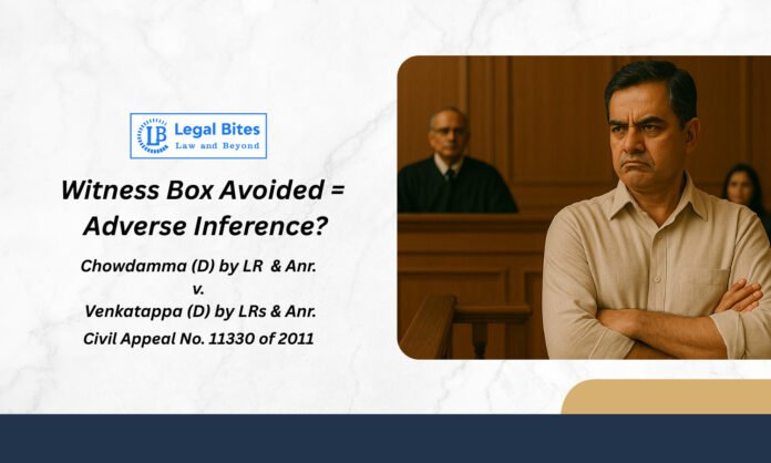 The Supreme Court in Chowdamma v. Venkatappa (2025) has reaffirmed a fundamental evidentiary principle: refusal to testify, when facts are within a party’s special knowledge, attracts adverse inference under Section 114(g) of the Evidence Act [Section 119(g) of the Bharatiya Sakshya Adhiniyam, 2023]. The Court emphasised that silence in such circumstances is not neutral but deliberate evasion.