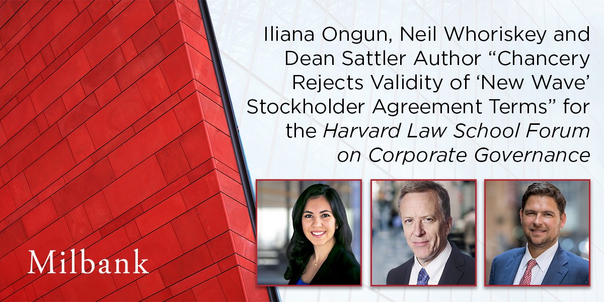 Milbank LLP partners Iliana Ongun, Neil Whoriskey and Dean Sattler co-authored an article titled “Chancery Rejects Validity of ‘New Wave’ Stockholder Agreement Terms” for the Harvard Law School Forum on Corporate Governance.