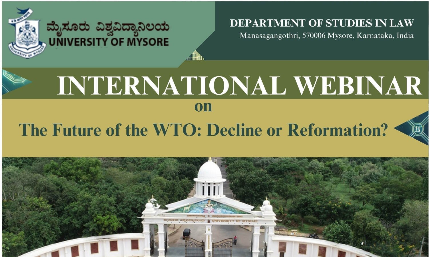 Department of Studies in Law, University of Mysore, is conducting an International webinar on “The Future of WTO: Decline and Reformation?” scheduled to be held on July 26, 2025.