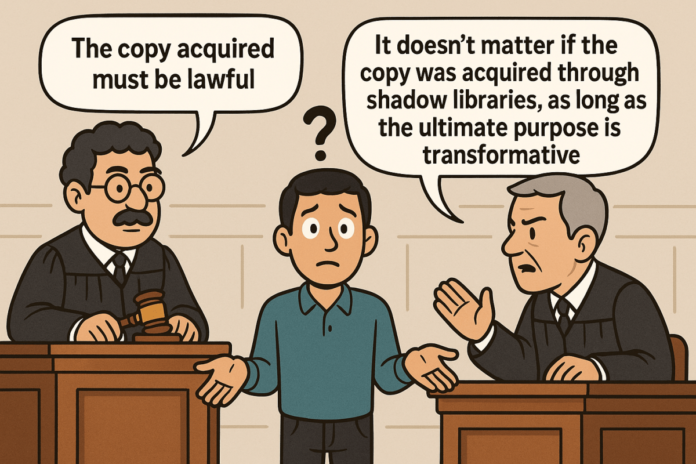 Last week, Judge Alsup and Judge Chhabria, both from the Northern District of California, US, delivered two distinct—and contradictory—decisions in the first substantive rulings on the Generative AI x Copyright debate: Andrea Bartz v. Anthropic and Richard Kadrey v. Meta, respectively. Both decisions address the “fair use” defense to infringement, as this was the sole issue raised for summary judgment. While both courts agreed that AI training is “highly transformative” (first factor of the fair use analyses) and therefore potentially covered by fair use, they split sharply on the “lawful first copy” requirement. This disagreement has significant implications for how Indian courts might approach similar cases, particularly given our research exemptions under Section 52 and the ongoing litigation between ANI and OpenAI. Part 1 of this two part post examines this disagreement. Part 2 will tackle the second disagreement: market dilution theory.