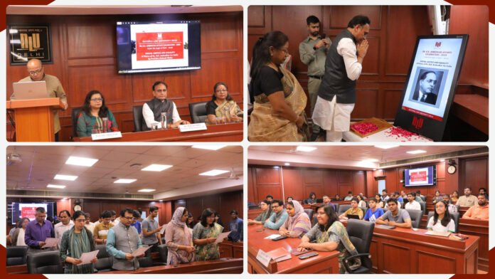 National Law University Delhi, under the aegis of IQAC, proudly hosted a programme to commemorate Dr. B.R. Ambedkar Jayanti on April 7, 2025. The event began with the floral tribute and reading the Preamble of the Constitution, reaffirming their shared commitment to the values of justice, liberty, equality, and fraternity. Prof. (Dr.) Ruhi Paul, Registrar, NLU Delhi, welcomed all delegates and Prof. (Dr.) Maheshwar Singh delivered the introduction of the programme.