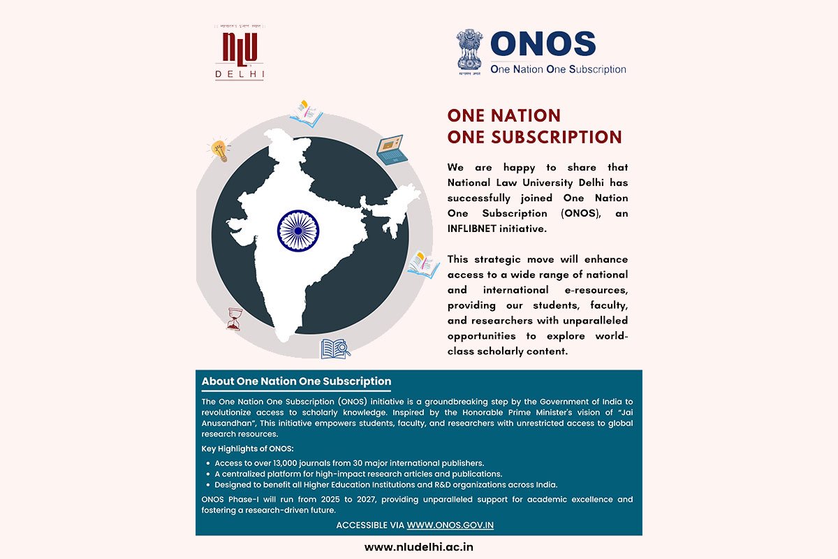 We are happy to share that National Law University Delhi has successfully joined One Nation One Subscription (ONOS) an INFLIBNET initiative; this strategic move will enhance access to a wide range of national and international e-resources.