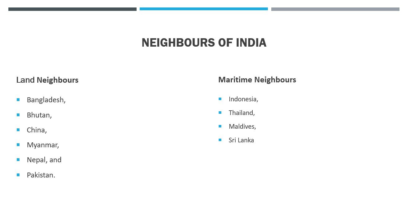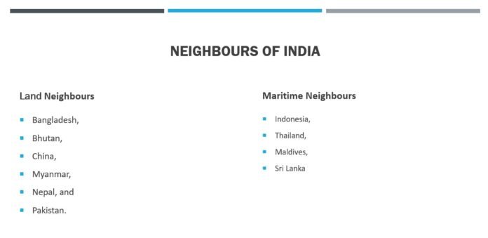 India shares land borders with Bangladesh, Bhutan, China, Myanmar, Nepal, and Pakistan. However, these rules do not apply to Indonesia, Thailand, Maldives and Sri Lanka, as these are Maritime Neighbours not sharing a land border with India.