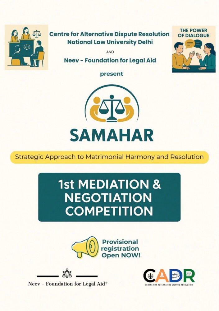 ‘SAMAHAR’ is the first-ever Mediation and Negotiation Competition focusing on matrimonial and family law disputes organized by Centre for Alternative Dispute Resolution, National Law University, Delhi and Neev – Foundation for Legal Aid.