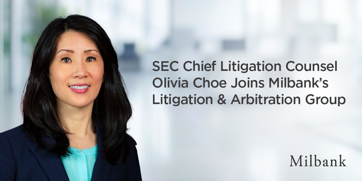 Milbank LLP is pleased to announce the addition of Olivia Choe as a partner in Washington, DC, starting on October 1. Ms. Choe’s arrival adds significant depth to the firm’s experience and capabilities in Securities and Exchange Commission matters, and further strengthens the firm’s Litigation & Arbitration group. Ms. Choe joins Milbank from the SEC, where she served as Chief Litigation Counsel. In this role she oversaw the nationwide litigation and trial program for the SEC’s Division of Enforcement, leading over 150 trial attorneys across the country.